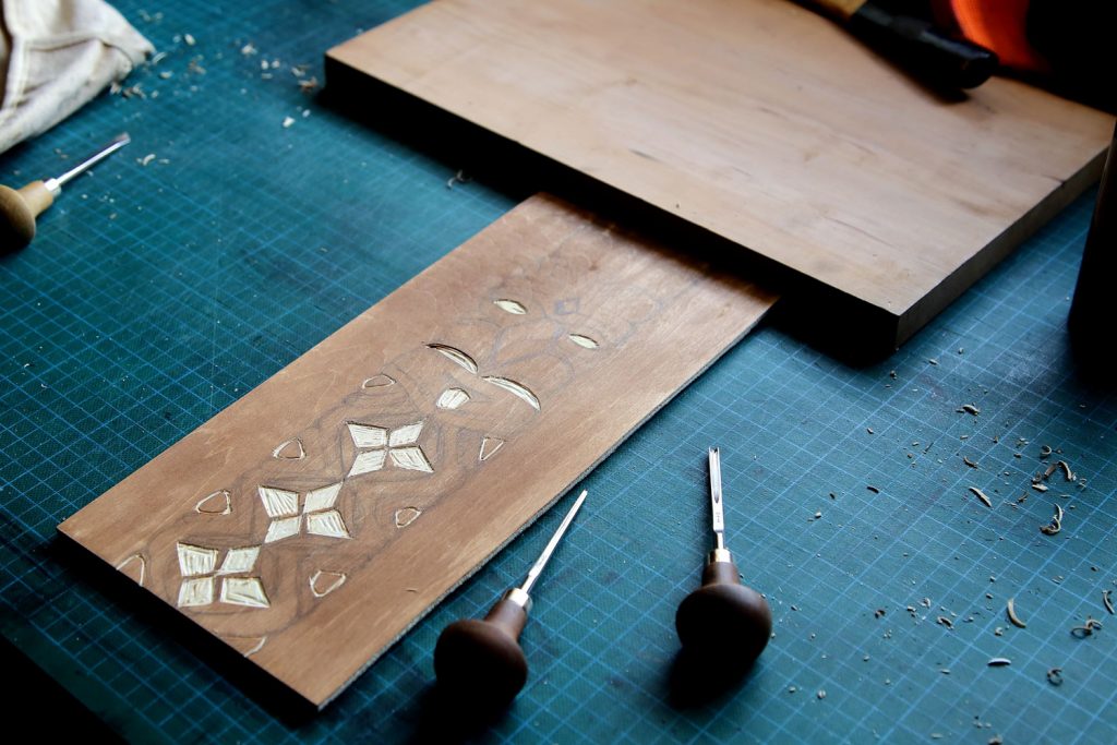 Grave ton dessin en relief sur linoléum à l’aide d’une gouge et imprime-le en couleur sur un papier pur chiffon.